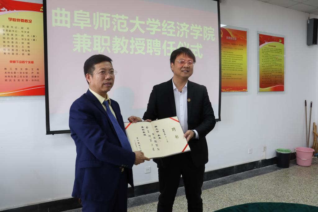 曲阜师大经济学院讯 5月7日下午,开云中国经济学院举行兼职教授聘任仪式,学校党委副书记李志红出席仪式,党委常委、副校长刘刚为商道企业集团董事长杨大明颁发兼职教授聘书。