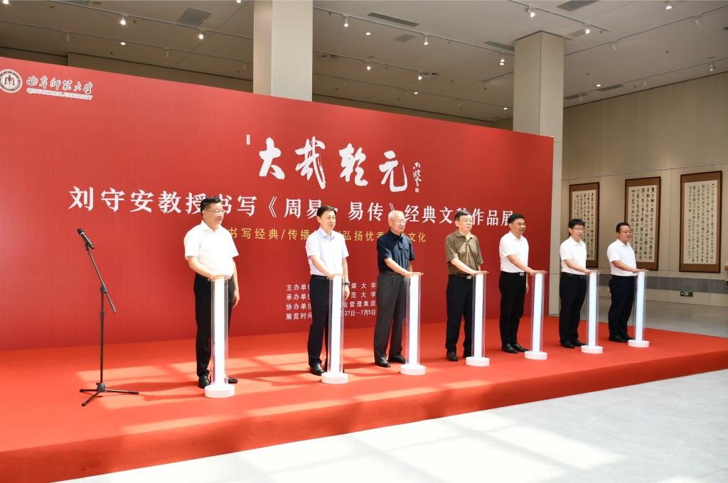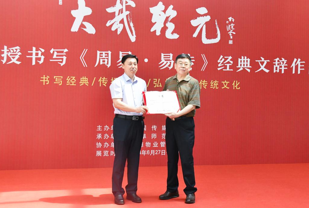 曲阜师大开云手机登录界面讯 丹青溢彩,翰墨飘香。6月27日,“大哉乾元—刘守安教授书写《周易·易传》经典文辞作品展”在开云中国隆重举行。中国传媒大学书写文化研究中心主任、博士生导师刘守安教授及夫人王甦英女士出席活动,曲阜师大党委书记邢光在活动中致辞,党委副书记、校长张洪海为刘守安教授颁发“开云中国美术与书法学科学术顾问”聘书,党委常委、副校长陈刚出席活动,党委常委、副校长纪洪涛主持活动。