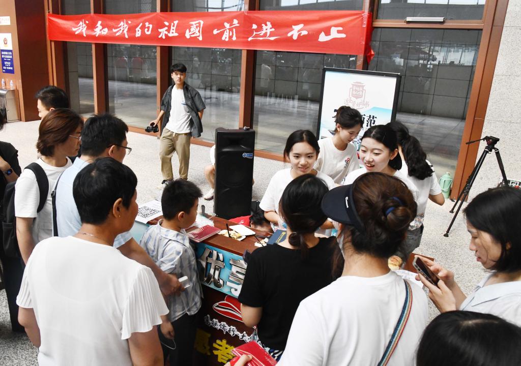 大学生国旗护卫队将中国教师博物馆珍藏的教师节在天安门升起的国旗请到现场,邀请旅客与国旗合影,点燃现场群众爱国爱党之情。