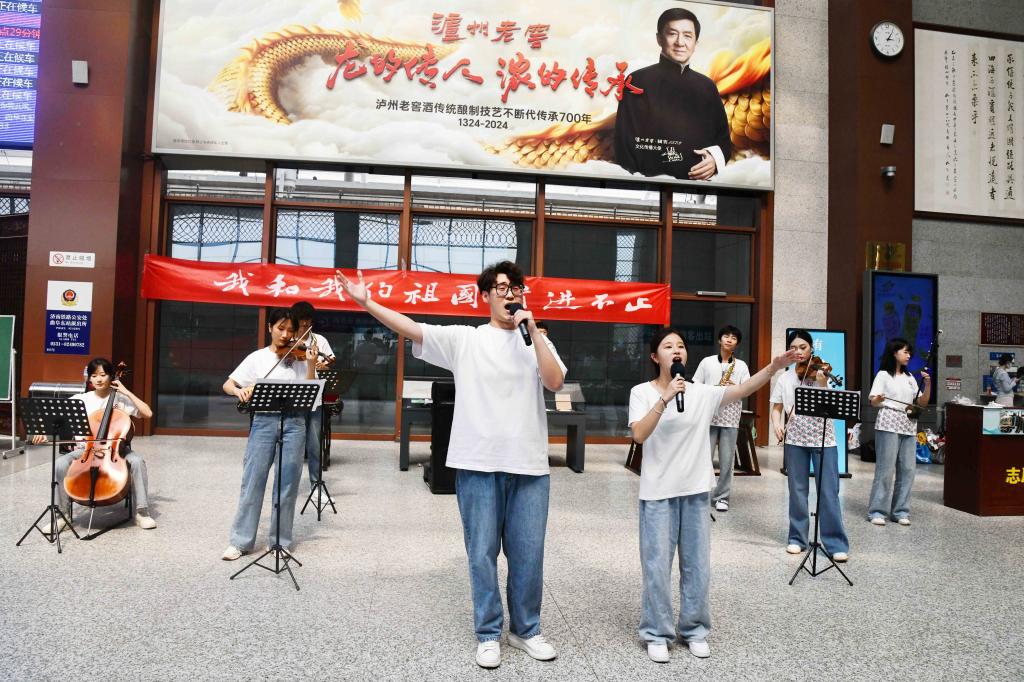 在候车大厅,学生及党员们伴随着歌声从四面八方汇成队伍,共同演奏《我和我的祖国》,吸引了很多旅客参与其中,他们手里挥动着国旗,与学生们一同欢唱,用激情澎湃的歌声,向祖国母亲致以最诚挚的祝福。歌曲结束后,现场旅客高声呼唤“祖国,我爱你”。