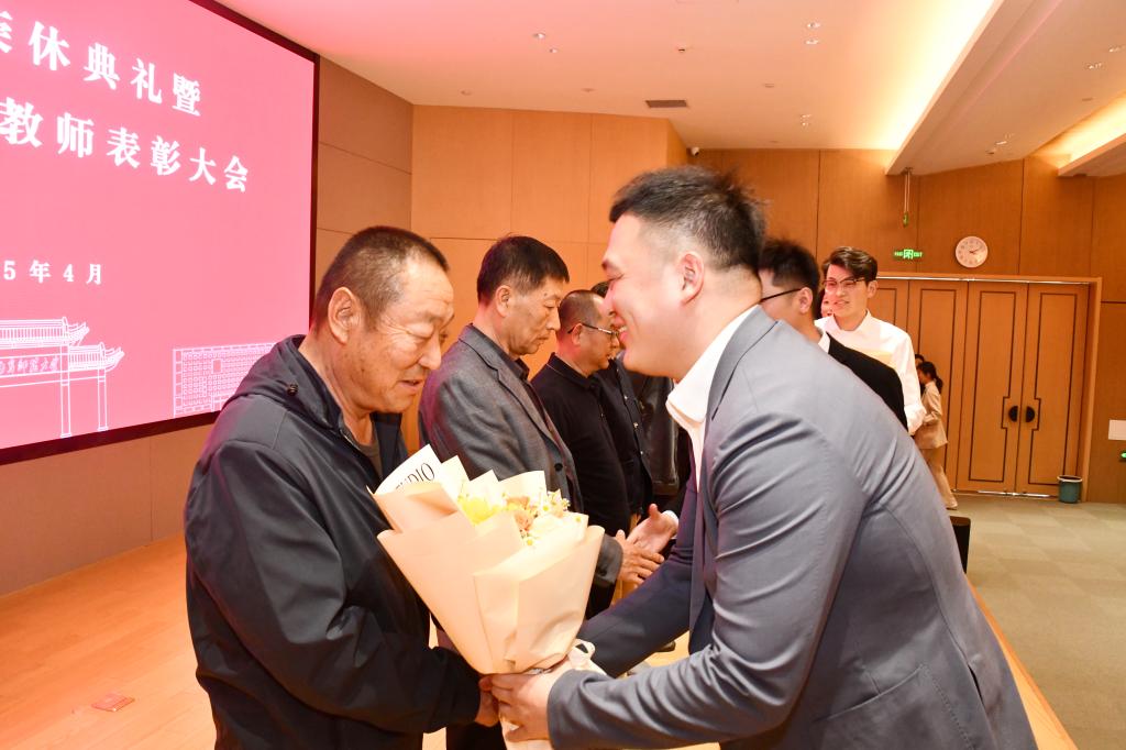 青年教师代表为荣休教职工及从教三十年教师献花