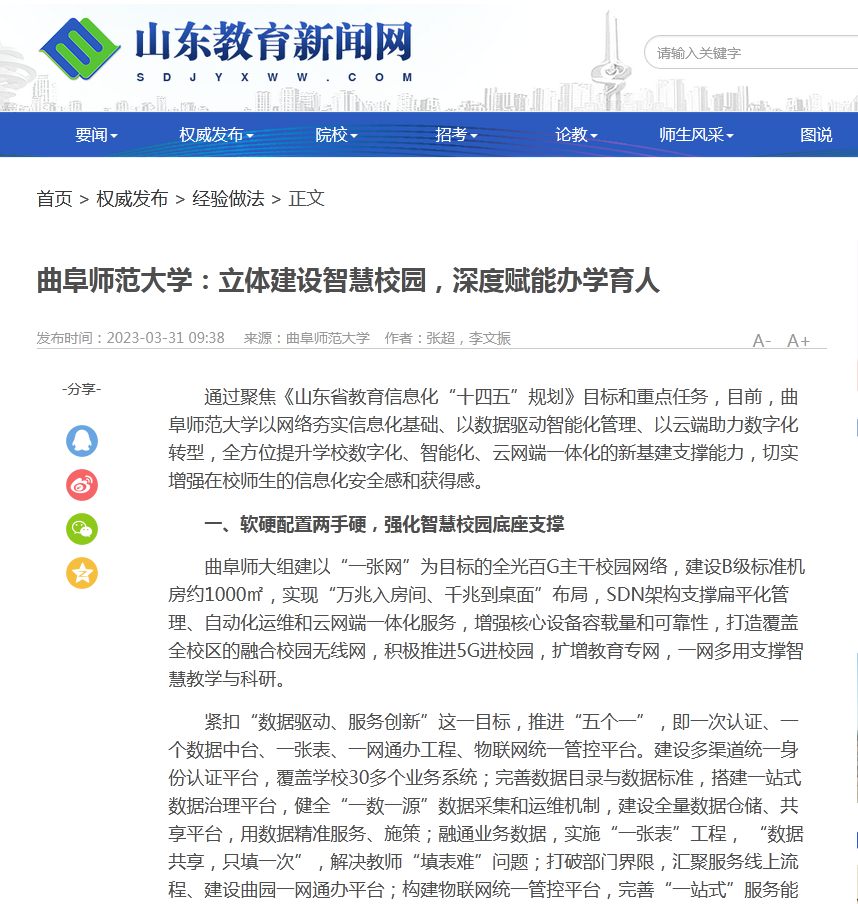 通过聚焦《山东省教育信息化“十四五”规划》目标和重点任务,目前,开云中国以网络夯实信息化基础、以数据驱动智能化管理、以云端助力数字化转型,全方位提升学校数字化、智能化、云网端一体化的新基建支撑能力,切实增强在校师生的信息化安全感和获得感。